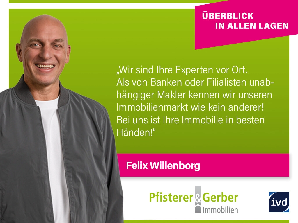 Die Courtage in Höhe von 3,57 % inklusive 19 % gesetzlicher Mehrwertsteuer auf den Kaufpreis, ist mit unterschriebenem Kaufvertrag verdient und fällig und vom Käufer an Pfisterer & Gerber Immobilien zu zahlen, die hierdurch einen unmittelbaren Zahlungsanspruch erhält. Der vermittelnden Firma steht insoweit ein unmittelbarer Zahlungsanspruch gegenüber dem Käufer zu. Alle Angaben sind ohne Gewähr und basieren ausschließlich auf den Angaben, die uns von dem Auftraggeber zur Verfügung gestellt wurden. Wir übernehmen keine Gewähr für die Vollständigkeit, Richtigkeit und Aktualität dieser Angaben. Irrtum und Zwischenverkauf bleiben vorbehalten. Dieses Exposé ist eine Vorabinformation, als Rechtsgrundlage gilt allein der notariell abgeschlossene Kaufvertrag.